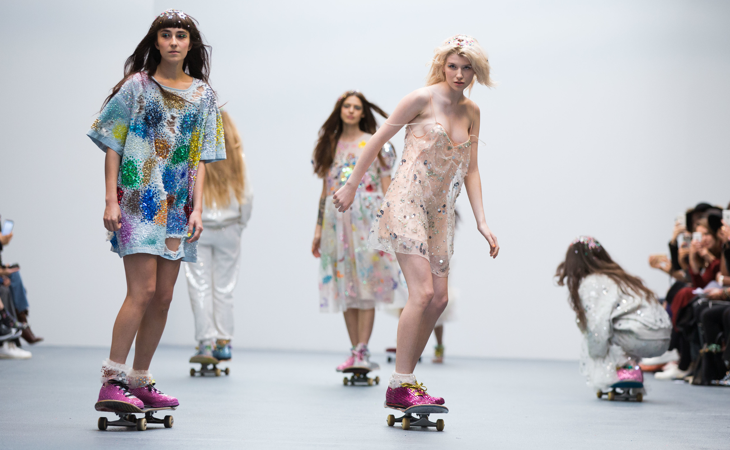 Models entered the runway on skateboards wearing dresses and trainers shimmering with sequins and glitter. Other looks evoked a mixture of the psychedelic sixties meets contemporary British festival culture – girls strutted along the catwalk in bucket hats and bell-bottom denim with heart-shapes intricately cut from the fabric.